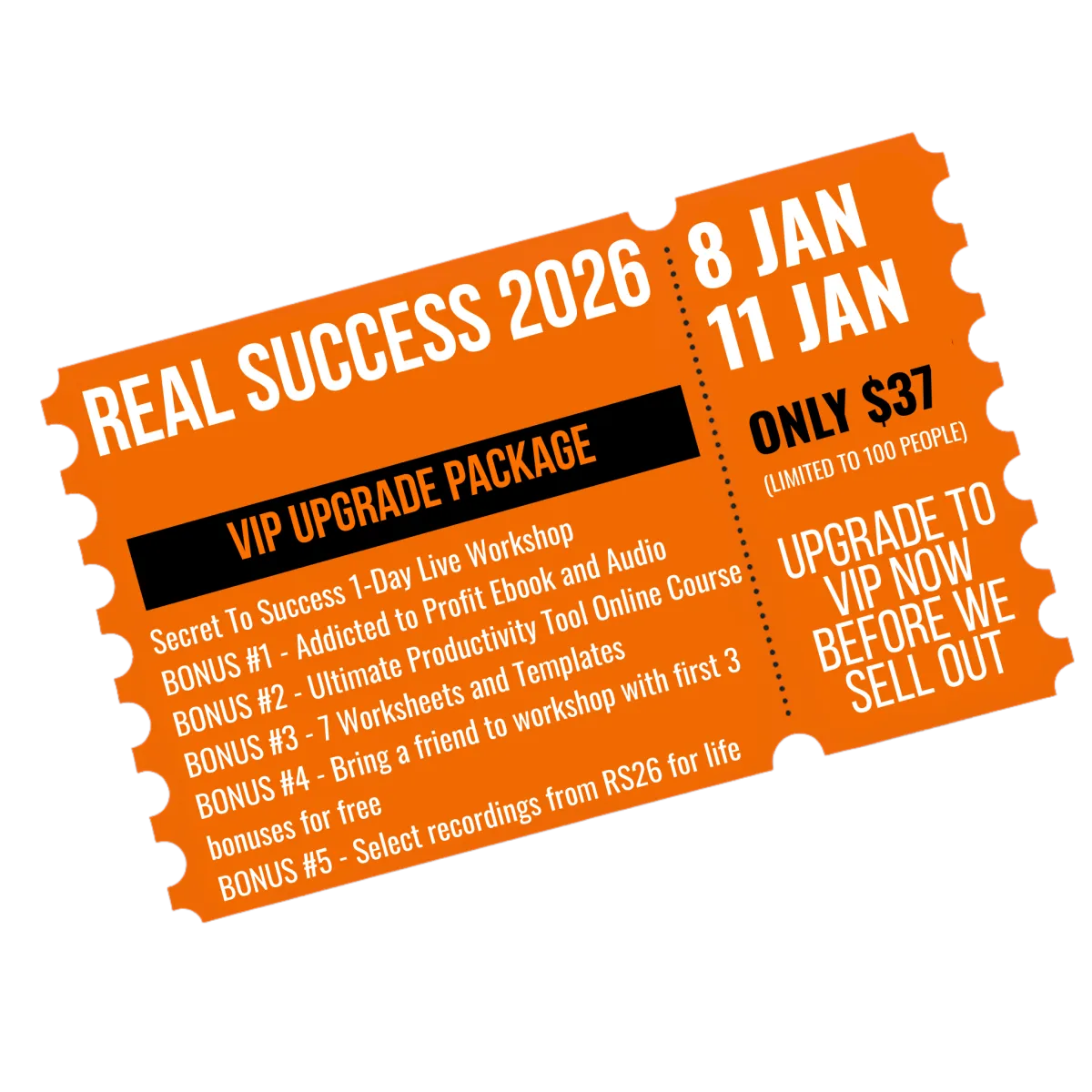 Attend the Secret To Success 1 Day Live Workshop, receive Addicted to Profit in ebook and audio, unlock the Ultimate Productivity Tool online course, use 7 powerful worksheets and templates, bring a friend who gets the first 3 bonuses free, plus keep select Vision 2026 recordings for life.